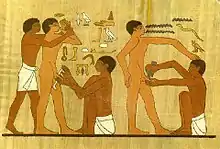 Также обрезание существовало у финикийцев[6], у народов Ханаана: аммонитян, эдомитян и моавитян[7]. Существование его у вавилонян и ассирийцев не доказано; у филистимлян обрезания не было. Практика обрезания крайней плоти у ближневосточных народов засвидетельствована с 3-го тысячелетия до н. э[8]. На рисунке, представляющем сцену этого обряда у древних египтян, изображение ножа напоминает собой форму ножей каменного периода. Это отчасти свидетельствует, что начало этого обычая теряется в глубокой древности. Изначально этот обряд был связан с ритуалом инициации, перехода к взрослой жизни, дававшим среди прочего право жениться. Еврейское существительное «хатан» (жених, зять) однокоренное с арабским hitan, обрезание. Однако, в Библии придаётся обрезанию исключительно религиозное значение[9].