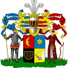 Описание герба: Выписка из Гербовника Щит разделён на четыре части, из них в первой в красном поле золотой Полумесяц рогами обращённый в левую сторону. Во второй части в голубом поле шестиугольная золотая Звезда. В третьей части в чёрном поле изображены золотые Ясли. В четвёртой части в золотом поле Рука из Облака выходящая с Мечом. Щит увенчан дворянскими шлемом и короной. Нашлемник: три страусовых пера. Намёт на щите голубой и красный, подложенный золотом. Щит держат с правой стороны Воин в латах, имеющий в руке Копьё, а с левой Татарин, держащий в руке Лук, а за плечами Колчан. |