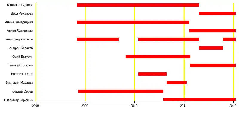 Юлия Пожидаева / Вера Романова (2008—2011) / (2011) Алина Сандрацкая / Алина Бужинская (2008—2011) / (2011) Александр Волков / Андрей Казаков (2008—2011; 2011) / (2011) Юрий Батурин / Николай Токарев (2009—2011) / (2011) Алина Ланина (2010—2011) |
