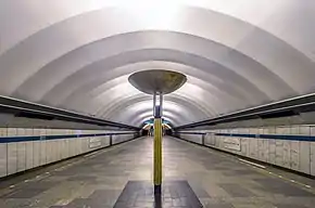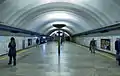 Путевые стены облицованы белым мрамором с карнизом из декоративного профиля. Пол выложен тёмно-серыми гранитными плитами. По оси станционного зала установлены светильники-торшеры из чеканной меди и профильного металла. Также из тёмного металла выполнено название станции. После замены освещения оно стало практически нечитаемым.