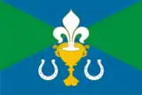 Полотнище с отношением ширины к длине 2:3, состоящее из синей полосы вдоль нижнего края в 1/4 полотнища и основной части, разделенной по диагоналям на четыре части, равные по площади: вверху и внизу — синие (без выделения границы с синей полосой), по сторонам — зеленые; посередине полотнища желтым и белым цветами воспроизведен кубок с геральдической лилией, а по сторонам от подставки кубка белым цветом воспроизведены две подковы. Обратная сторона аналогична лицевой.