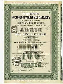Дальнейшая деятельность Общества распространялась на расширение сети костеобжигательных заводов по всей империи, а также развития экспорта и сети продаж[2]. Первоначальный основной капитал Общества (на 1874 г.) составлял 350 тысяч рублей, разделенных на 3500 акций[2]. Акции Общества подлежали свободной передаче третьим лицам[2].