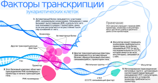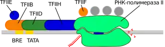 | TFIIH | 9 | Расплетает ДНК в сайте начала транскрипции, фосфорилирует РНК-полимеразу II и высвобождает её с промотора |