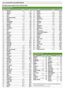 Для ОГ использовались данные за период с 2001 по 2006 гг. Данные по количеству недоедающих предоставлены Продовольственной и сельскохозяйственной организацией ООН за период 2002—2004 гг., Данные по детской смертности предоставлены Детским фондом ООН — ЮНИСЕФ за период 2006 г. Данные по питанию детей за 2006 год предоставлены ВОЗ.
