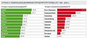 С 1990 по 2008 гг., Ангола, Эфиопия, Гана, Гаити, Малави, Мозамбик, Перу и Вьетнам уменьшили свой ОГ более, чем на 10 пунктов. В 11 государствах, (Северная Корея, государства на юге от Сахары) ОГ вырос. Конфликты и политическая нестабильность в Бурунди, на Коморах, в ДРК, Гвинее-Бисау и Либерии привели к ухудшению продовольственной ситуации. В Ботсване и Свазиленде СПИД и постоянная нестабильность привели к разрушению системы продовольственной безопасности, несмотря на значительные государственные богатства. Негативные тенденции в экономике вообще и в пищевой промышленности в частности в Северной Корее увеличило число недоедающих и детей с недостатком веса и, как следствие, ОГ Северной Кореи.
