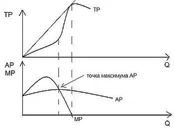 Из общего продукта выводятся еще две важных характеристики предприятия — средний продукт (AP) и предельный продукт (MP). Средний продукт характеризует производительность факторов производства, предельный продукт — производительность последней дополнительной единицы фактора.