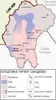 | Чучер-Сандево мак. Чучер-Сандево алб. Komuna e Çuçerit | ![]() | ![]() | 240,78 | 8493 | 42°06′36″ с. ш. 21°22′48″ в. д. | македонцы — 47,3 % сербы — 28,6 % албанцы — 22,9 % | ![]() | ![]() | [79] |