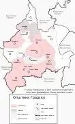 | Градско мак. Градско алб. Komuna e Grackës | ![]() | Файл:Coat of arms of Gradsko Municipality.svg | 236,19 | 3760 | 41°34′00″ с. ш. 21°56′00″ в. д. | македонцы — 77,77 % босняки — 12,37 % цыгане — 3,38 % албанцы — 3,32 % турки — 1,89 % | ![]() | ![]() | [21] |
