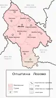 | Лозово мак. Лозово алб. Komuna e Llozovës | ![]() | ![]() | 166,32 | 2858 | 41°46′51″ с. ш. 21°54′04″ в. д. | македонцы — 86,47 % турки — 5,49 % аромуны — 4,27 % албанцы — 1,22 % | ![]() | ![]() | [47] |