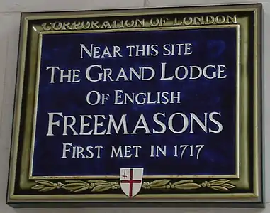 Муниципальные власти Лондона, Лондонская городская корпорация, установили памятную доску около того места, где произошло первое историческое собрание первой великой ложи в 1717 году.