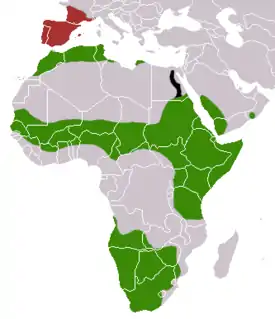 Зелёный — аборигенный ареал, красный — завезён, чёрный — вымер |
