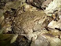 Серая жаба среди опавшей листвы