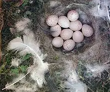 В сезон обычно две кладки, хотя в некоторых регионах, в частности в Великобритании, Германии, Марокко и на Корсике яйца откладываются лишь однажды[5]. Первая кладка обычно приходится на начало — середину мая, повторная на вторую половину июня[6]. Количество яиц варьирует в зависимости от биотопа и максимальной численности, 7—13 яиц, достигает в листопадных дубовых лесах Западной Европы. В смешанных и вечнозелёных лесах размер кладки ниже — 6—8 яиц, а в пригородах и городской черте ещё ниже (это объясняют большим количеством экзотических растений, и следовательно меньшим количеством насекомых). Большие кладки, содержащие до 18 яиц, свидетельствуют об использовании гнезда двумя самками[5]. Яйца типичные для всех синиц и внешне трудноотличимы от других близких видов — имеют гладкую, немного блестящую скорлупу, основной белый фон и многочисленные ржавчатые пятна и крапины, более густые со стороны тупого конца. Размеры яиц (14—18) x (10.7—13.5) мм, вес 0,87—1,16 г. Насиживание начинается с последнего яйца, насиживает только самка в течение 12—16 дней, в то время как самец кормит её 1—2 раза в час. При приближении к дуплу пришельца птицы шипят, как змеи, либо жужжат, как осы[13]. Изредка самка прикрывает яйца пухом и сама вылетает в поисках корма.