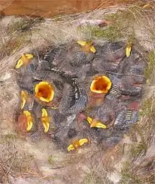 Птенцы появляются асинхронно в течение нескольких дней, в первое время они беспомощны и у них отсутствует какой-либо пух. Первые 4—6 дней корм приносит только самец, а самка в это время находится в гнезде и обогревает потомство. Через 8 дней оба члена пары уже в равной доле принимают участие в кормлении молодняка. В случае полигинии, когда самец поочерёдно посещает несколько гнёзд, его участие в воспитании потомства заметно снижается до 20—30 %. Период оперения занимает 16—23 дня[5], после чего птенцы покидают гнездо и начинают самостоятельно добывать себе корм. Первые слётки появляются в начале июня, лётные птенцы второго помёта в конце июля[6].