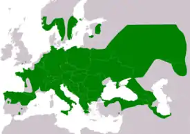 Обитает практически на всей территории Европы (кроме Ирландии, большей части Великобритании, Северной Скандинавии, центральной и южной части Иберийского полуострова и островов Средиземного моря) до западного Казахстана и Кавказа, а также до северного Ирана.