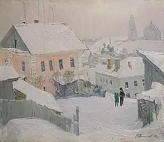 Ездили мы и в город Старицы, зимой. Работали с увлечением и восторгом. Красивый русский городок с сохранившейся стариной, особенно красив зимой, среди белого снега. Работали и в мороз, и в слякоть, бывало, занесёт палитру снегом, стряхнёшь и продолжаешь работать, невозможно уйти, хочется закончить.