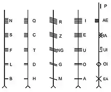 Каждое aicmí называется по названию первой буквы, входящей в него. В Aicme Beithe входят буквы b, l, f, s, n; в Aicme hÚatha входят буквы h, d, t, c, q; в Aicme Muine — m, g, ŋ, z, r; в Aicme Ailme — a, o, u, e, i. Также существовали пять добавочных букв — forfeda — которые обозначали дифтонги eo, oi, ui, io, ae[1].