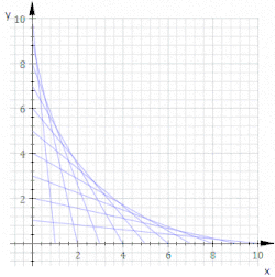 Кривая называется огиба́ющей семейства кривых , зависящих от параметра , если она в каждой своей точке касается хотя бы одной кривой семейства и каждым своим отрезком касается бесконечного множества этих кривых.