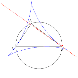 Прямые Симсона (красным цветом) являются касательными к дельтоиде Штейнера (синим цветом).