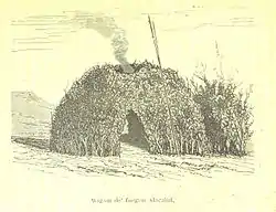 «Посредине вигвама горел костёр из чурбачков. У стен виднелись постели из звериных шкур с уютными, похожими на гнезда вмятинами, сделанными человеческими телами за долгие дни и ночи. На полу подле огня лежал кусок полувысушенного мяса морского льва, нога гуанако и скелет огромной огнеземельской крысы коати. Искусно сделанная соломенная корзина и винчестер — единственные предметы утвари и орудий производства. В вигваме было тепло и сухо. В таком пристанище с меньшей затратой топлива и труда даже в самые жестокие зимние холода, несомненно, чувствуешь себя уютнее, чем в любом временном жилище белого…»[6]