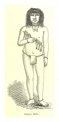«Это были самые жалкие и убогие создания, каких я когда-либо видел. На восточном берегу у туземцев... есть плащи из шкур гуанако, на западном они имеют тюленьи шкуры. Здесь же у племён, живущих посредине, мужчины носят обыкновенно выдровую шкуру или какой-нибудь маленький лоскуток, примерно с носовой платок, едва достаточный, чтобы прикрыть спину до поясницы. Эта накидка стягивается на груди тесёмками и, смотря по тому, откуда дует ветер, передвигается из стороны в сторону. Но те огнеземельцы, которых мы встретили в челноке, были совсем нагие, и даже одна взрослая женщина была совершенно в таком же виде. Эти жалкие бедняги были какими-то недоростками, их безобразные лица были вымазаны белой краской, кожа была грязная и засаленная, волосы спутаны, голоса неблагозвучны, а жесты порывисты. Глядя на таких людей, едва можно поверить, что это наши ближние, живущие в одном мире с нами... Ночью эти люди, голые и едва защищённые от ветра и дождя здешнего бурного климата, спят по пяти, по шести часов на сырой земле, свернувшись подобно животным... Природа, сделав привычку всемогущей, а результаты её действия наследственными, приспособила огнеземельца к климату и естественным произведениям его скудной родины...»[4]