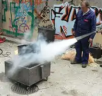 Огнетуши́тель — переносное или передвижное устройство для тушения очагов пожара за счёт выпуска запасённого огнетушащего вещества[1]. Ручной огнетушитель обычно представляет собой цилиндрический баллон красного цвета с соплом или трубкой. При введении огнетушителя в действие из его сопла под большим давлением начинает выходить вещество, способное потушить огонь. Таким веществом может быть пена, вода, какое-либо химическое соединение в виде порошка, а также диоксид углерода, азот и другие химически инертные газы. Огнетушители в России должны находиться во всех производственных помещениях, а правила дорожного движения многих стран обязывают держать огнетушитель в каждом автомобиле.