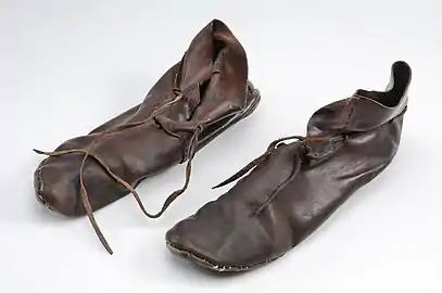 На ногах носили либо сапоги, либо башмаки из кожи. Простейшая обувь представляла собой кусок кожи, завязывающийся на ноге ремешками или тесемкой, напоминала римские солдатские калиги. Головным убором всех скандинавов бьmа низкая широкополая шляпа, скреплявшаяся узким ремешком под подбородком и изготовлявшаяся из кожи, меха или войлока.