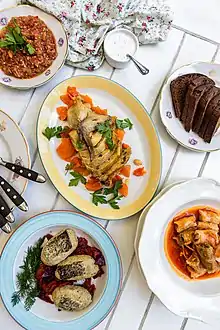 - Фаршированная рыба или «гефилте фиш» (идиш געפֿילטע פֿיש)