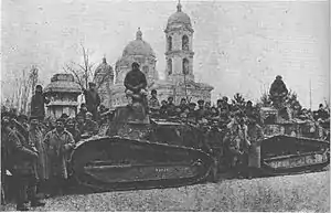 5 (18) марта 1919 года после торжественного молебна, совершенного Митрополитом Платоном на Соборной площади, Одесская стрелковая бригада выступила на фронт. Ей был поручен участок от Черноморского побережья в районе Очакова до железнодорожной линии Одесса — Николаев. Далее на север позиции занимали французские, греческие и польские войска[21].