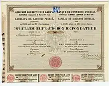 Владельцы частных банкирских домов являлись соучредителями акционерных банков и небанковских кредитных организаций (товарищества взаимного поземельного кредита, основанного в 1866 г. и др.) Среди учредителей Одесского коммерческого банка в 1870 г. были виднейшие представители одесской деловой элиты того времени Герман и Лев Рафаловичи, представитель знаменитой банкирской династии Эфрусси Игнатий Эфрусси, Федор Родоканаки,[3] а также, как явствует из Примечания к 1-му Параграфу главы I Высочайше утвержденного 17 марта 1870 г. Устава банка: