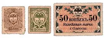 | Марки-деньги и расчётные знаки г. Одессы выпуска 1917—1918 | |||||||||