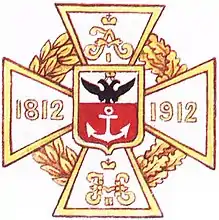 Утвержден - 4.5.1910. Белый эмалевый крест с золотым ободком, лежащий на золотом венке. На концах его золотом изображены вензеля Императоров Александра I и Николая II и юбилейные даты: «1812-1912». В центре герб Одессы (наверху на белом поле черный двуглавый орел, внизу на красном — серебряный якорь).