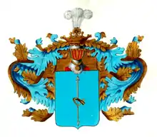 Щит увенчан обыкновенным дворянским шлемом с дворянской на нём короной и тремя страусовыми перьями. Намёт на щите голубой, подложен золотом.