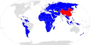 | Азия | 38 | Азербайджан[30], Армения, Афганистан, Бангладеш, Бахрейн, Бруней, Восточный Тимор, Вьетнам, Грузия[30], Индонезия, Ирак, Иран, Казахстан[31], Камбоджа, Катар, Кипр, Кыргызстан, Кувейт, Лаос, Ливан, Малайзия, Мальдивы, Монголия, Мьянма, Непал, Объединённые Арабские Эмираты, Оман, Пакистан, Саудовская Аравия, Сингапур, Сирия[32][33], Таджикистан, Таиланд, Турция[31], Узбекистан, Филиппины, Шри-Ланка, Южная Корея |