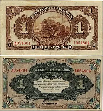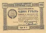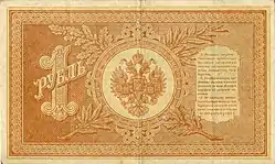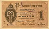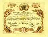 Хотя бумажные деньги появились в России ещё в 1769 году (см. «Ассигнации»), первые рублёвые банкноты были отпечатаны только в 1843 году[9]. В годы Гражданской войны некоторые местные правительства выпускали денежные знаки номиналом 1 рубль, в том числе в форме марок"). Последние банкноты СССР достоинством в 1 рубль датированы 1991 годом.