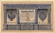 150×90 | оранжевый | Номинал, растительный орнамент, номер банкноты 6-значный | Номинал, растительный орнамент, герб Российской империи | Есть | 1898 |