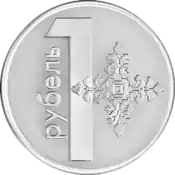 | Описание | В центре цифровое обозначение номинала — «1», слева от цифры вертикально расположена надпись — «РУБЕЛЬ», справа — стилизованное изображение национального орнамента |