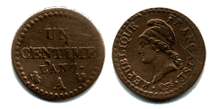 Чеканка монет в 1 сантим начата в период Первой республики, в 1797 году. Рисунок монеты был выполнен генеральным гравёром Огюстеном Дюпре. Год чеканки обозначался годом республиканского календаря[1]. В 1800 году чеканка была приостановлена и вновь начата только в 1848 году, в период Второй республики. Рисунок монет (типа Дюпре) остался прежним, изменилось только обозначение года чеканки.