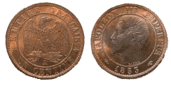 После провозглашения Второй империи в 1853 году начата чеканка монет нового образца, который разработал Жан-Жак Барр. Диаметр и вес монеты (по сравнению с ранее выпускавшимися) был уменьшен. Первоначально на монетах помещался портрет императора Наполеона III без лаврового венка (тип Tête nue), а с 1861 года — портрет императора в венке (тип Tête laurée). Новый портрет выполнил Альбер-Дезире Барр.