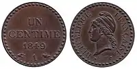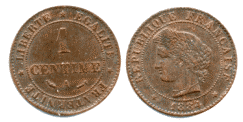 В 1872 году Третьей республикой начат выпуск новых 1-сантимовых монет. Диаметр и вес монет, установленные в период Второй империи, остались неизменными. Новый тип монет («Церера») разработал Эжен Удине. В 1898 году тип монет изменился. Новый тип монет («Дюпюи») разработал Жан-Батист-Даниэль Дюпюи. В 1920 году, в связи с инфляцией, выпуск монеты был прекращён[2][3].