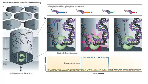 В основе метода лежит использование Zero-mode waveguide (ZMW) — углублений диаметром несколько десятков нанометров, ко дну которых прикреплена единичная молекула ДНК-полимеразы. Сквозь дно в ZMW-ячейку подаётся свет. Особенность конструкции ZMW-ячейки не даёт распространяться световой волне и оставляет освещённым только объём порядка 20 цептолитров (20 × 10−21 литров) около дна ячейки. Это позволяет наблюдать флуоресценцию единичной флуоресцентной метки, пришитой к нуклеотиду, в данный момент встраиваемому ДНК-полимеразой. Соответственно к четырем типам нуклеотидов пришиты разные флуоресцентные метки, что позволяет различать их. В результате при полимеризации цепи ДНК зафиксированным в ZMW ферментом можно получить зависимость интенсивности флуоресценции от времени, из графика которой по пикам разного спектра определяется последовательность ДНК[1].