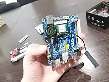 | ODROID | XU | Samsung Exynos 5 | 4x Cortex-A15 1,6 ГГц + 4x Cortex-A7 8 cores, big.LITTLE | PowerVR SGX544MP3 GPU | 2 ГБ LPDDR3 | Micro-SD slot, eMMC 4.5 module connector | ||