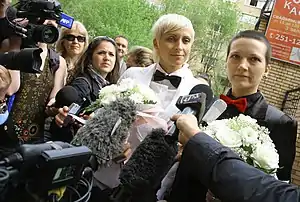 Аналогичная торжественная церемония заключения брака прошла чуть ранее в Кутузовском ЗАГСе Москвы между Алисой Брукс и Алиной Дэвис. Последняя идентифицирует себя как андрогин, однако по паспорту сохраняет мужской пол и имя (Дмитрий Кожухов)[107][108].