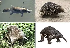 ![]() 1-й ряд: утконос, австралийская ехидна; 2-й ряд: проехидна Брюйна, проехидна Бартона. | ||||||||||||