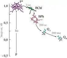 Перенос электрона играет важную роль во многих биохимических реакциях. Например, одна из важных стадий фотосинтеза — перенос электрона через бислойную клеточную мембрану. Он начинается от димера бактериохлорофилла (P) и включает серию переходов электрона от одного вещества к другому (рис.). Конечный акцептор электрона — молекула хинона (QB).