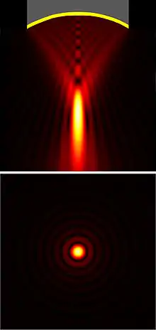 где — функция Бесселя первого рода первого порядка. Такое поперечное распределение интенсивности, имеющее вид круглого пятна с окружающими его дифракционными кольцами, известно в оптике под названием «диск Эйри».