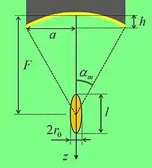 Максимальная интенсивность в центре фокальной области при не очень больших углах (<45°) может быть выражена через отношение площади источника и площади поперечного сечения фокальной области [1]