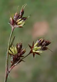 Компактное головчатое соцветие состоит из двух — пяти (редко больше) цветков; цветки сидячие или на цветоножках. Верхние стеблевые листья по длине примерно равны соцветию. Листочки околоцветника ланцетные, остроконечные, до 3 мм длиной. Они равного размера, красновато-коричневые, с плёнчатым краем. Пыльники примерно в 4 раза длиннее тычиночных нитей. Столбики длиннее завязи.