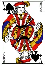 В XIV веке, с появлением в средневековой Франции игральных карт, популярностью стала пользоваться так называемая французская колода. Предположительно развилась она из немецкой 32-карточной колоды путём упрощения[53]. «Картинки» (или фигуры, онёры, от фр. honneur — честь) связывались с теми или иными историческими или легендарными персонажами. Так валет пик назывался «Hogier» и обозначал Ожье Датчанина[54][55].