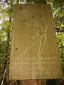Приблизительно на трёх-четырёх километровой тропе находятся около 15 - 20 снарядов, как например, штанги для подтягивания или пеньки для прыжков через козла – часто вместе с табличкой с пояснением к упражнению.